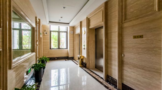 地下车库限行高3米,可进出货车;每幢大厅高5米, 配客货梯各一部,货梯承重两吨;